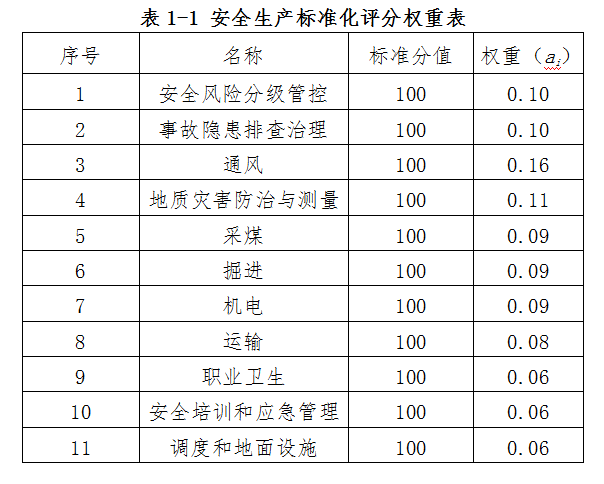 第十八條 煤礦安全生產(chǎn)標(biāo)準(zhǔn)化考核滿(mǎn)分為100分,采用各部分得分乘以權(quán)重的方式計(jì)算,各部分的權(quán)重見(jiàn)表1-1。